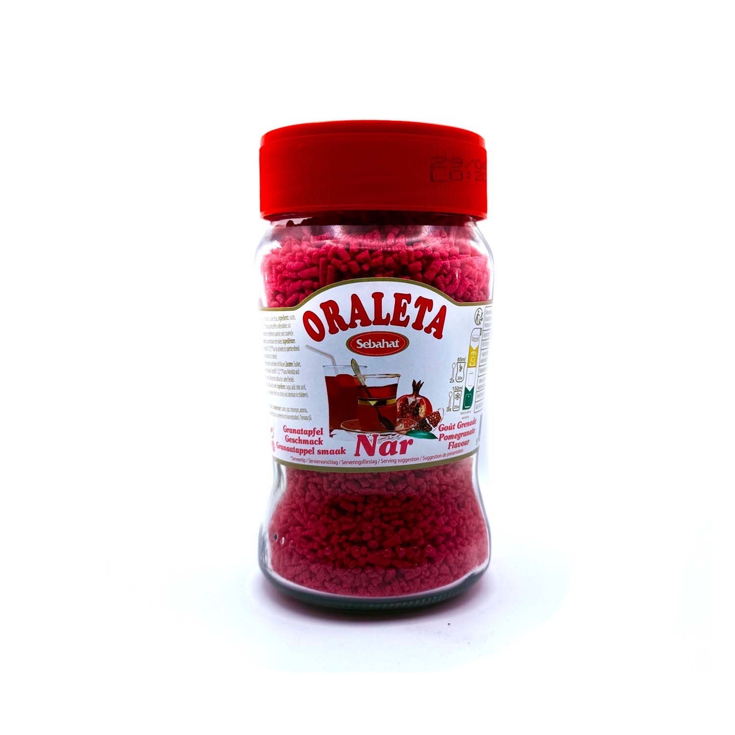 SEBAHAT ORALETA (NAR) GRANELLE DI MELOGRANO.Granelli per la preparazione di bevande calde o fredde.Preparazione: 2-3 cucchiaini in una tazza .ING: zucchero,acidificante: acido citrico,aromi,acqua, coloranti: E122*(*puo' avere effetti particolari sulle attivita' e attenzione dei bambini). Scadenza o TMC: vedere sulla confezione. EURASIA SRL VIA PIAVE 11 MODENA